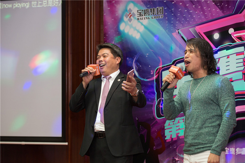雙人PK賽環(huán)節(jié),工程管理七部選手陳輝武帶來的溫馨賽前視頻引發(fā)全場歡呼,把工作、愛好、家庭完美融合,展示了寶鷹集團(tuán)員工積極向上的生活態(tài)度?!皩汑椇寐曇簟蓖鶎眠x手吳錦朋、羅曉芬也傾情助場,分別帶來帶來歌曲《 流浪記 》、《梅花淚》,掀起現(xiàn)場熱潮。