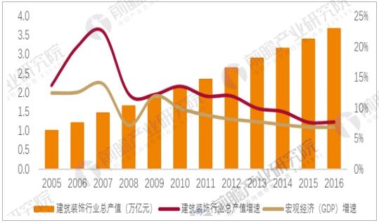 建筑裝飾業(yè)為我國建筑行業(yè)二級分類中的一個分支,根據(jù)建筑物使用性質不同又可以進一步細分為建筑幕墻(外裝)、公共建筑裝修(內裝)、住宅裝修。據(jù)前瞻產業(yè)研究院發(fā)布的《建筑裝飾行業(yè)發(fā)展前景與投資分析報告》數(shù)據(jù)顯示,2016年全國建筑裝飾工程總產值為3.66萬億元,同比增長7.65%。