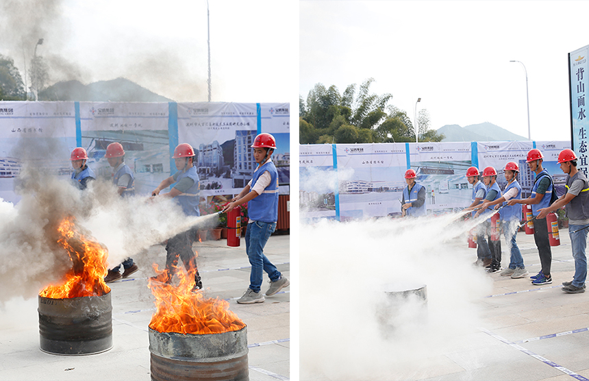 同時(shí),授課教官現(xiàn)場(chǎng)講解疏散逃生要領(lǐng),詳細(xì)介紹了消防滅火器的正確使用方法和步驟。并對(duì)施工現(xiàn)場(chǎng)安全用電、正確使用機(jī)械設(shè)備防護(hù)等方面進(jìn)行了宣傳與講解。當(dāng)滾滾濃煙觸發(fā)煙霧報(bào)警后,警笛聲響起,工人組隊(duì)有序疏散至安全區(qū)并清點(diǎn)人數(shù),消防水車迅速抵達(dá)進(jìn)行滅火。整個(gè)演練過(guò)程緊湊嚴(yán)密、秩序井然,達(dá)到了演習(xí)預(yù)期效果。