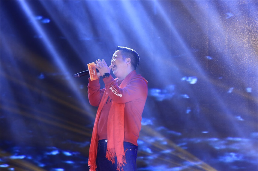 ▲寶鷹集團董事局主席古少明領(lǐng)唱《沒有共產(chǎn)黨就沒有新中國》