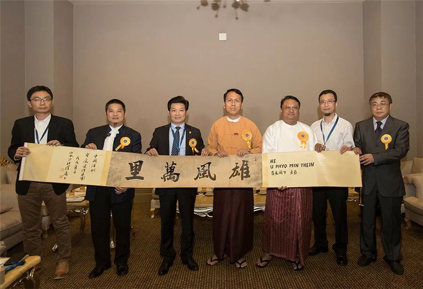 ▲寶鷹集團(tuán)董事局主席古少明一行向仰光省省長吳漂敏登贈送西泠印人王躍慶書法作品“雄風(fēng)萬里”