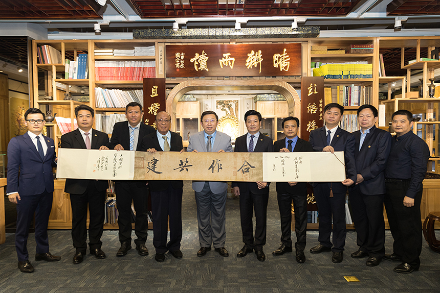 ▲寶鷹集團(tuán)向緬甸建筑商協(xié)會會長、原創(chuàng)集團(tuán)主席塔特贈送西泠印人王躍慶書法作品“合作共建 互利共贏”