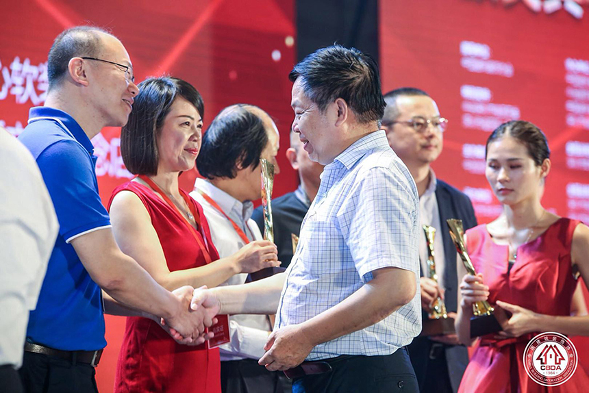 ▲ 寶鷹集團(tuán)總裁成湘文為中國建筑裝飾設(shè)計獎金獎得主頒獎