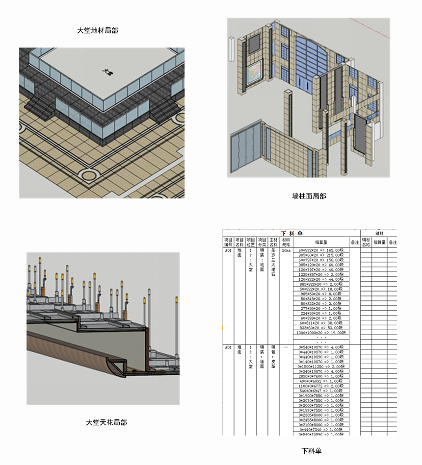 項目是由大堂、洽談區(qū)、辦公室、銷售休息室、衛(wèi)生間等幾個分區(qū)組成的銷售中心。該項目對地面鋪裝、墻柱面裝飾、天花吊頂裝飾三個板塊進行了建模及導(dǎo)出材料下料單。