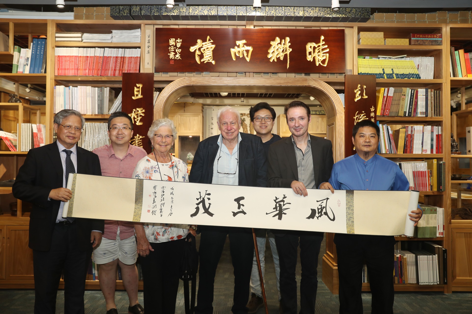 ▲ 寶鷹集團(tuán)副總裁古樸向阿克塞爾·貝倫斯院士贈(zèng)送西泠印社社員、寶鷹美術(shù)館館長王躍慶書法作品《風(fēng)華正茂》