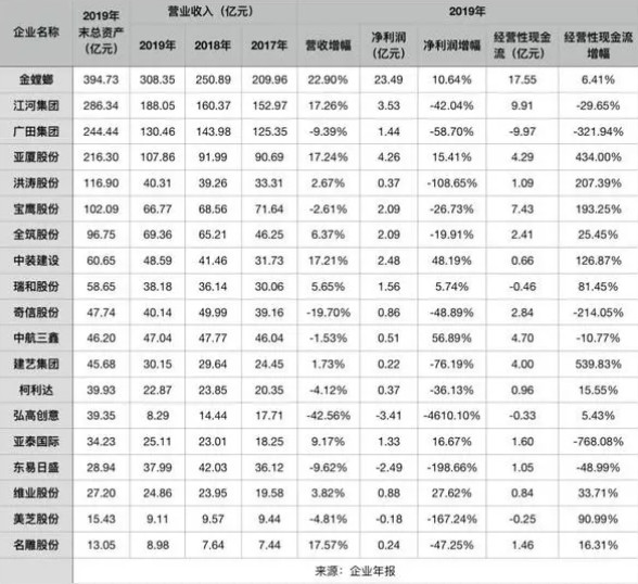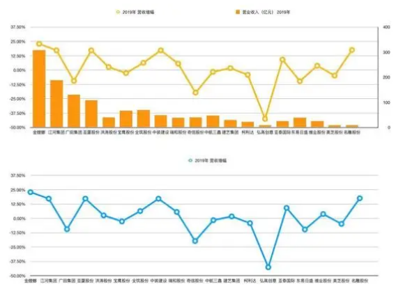 近日,隨著最后一家A股建筑裝飾企業(yè)洪濤股份的年報浮出水面,A股建筑裝飾企業(yè)2019年年報全部公布完畢,業(yè)績增速整體放緩、行業(yè)集中度不斷提升的發(fā)展態(tài)勢一目了然。在本研究報告統(tǒng)計的19家典型樣本A股建筑裝飾企業(yè)中,有的深耕主業(yè),在2019年實現(xiàn)業(yè)績平穩(wěn)增長,有的則出現(xiàn)業(yè)績大幅下滑,甚至出現(xiàn)大額虧損。其中,弘高創(chuàng)意虧損3.41億元,同比下降4610.10%。營收和歸屬于上市公司股東凈利潤(以下簡稱“凈利潤”)雙增長的只有6家,分別為金螳螂、亞廈股份、中裝建設(shè)、瑞和股份、亞泰國際、維業(yè)股份。