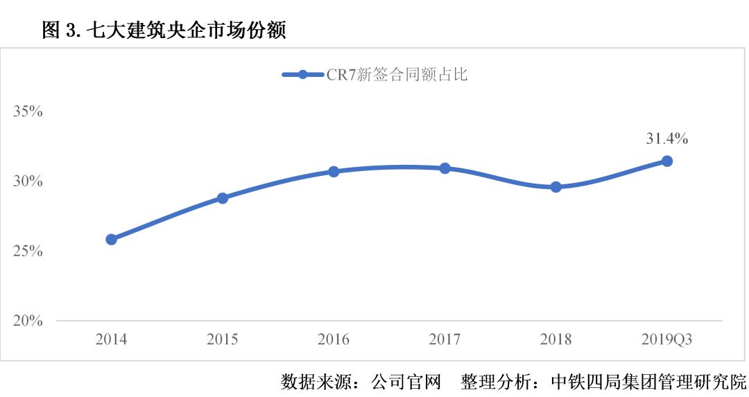 2.行業(yè)集中度持續(xù)提升。從中國建筑、中國中鐵、中國鐵建、中國交建、中國電建、中國能建、中國中冶7大建筑央企年度新簽合同額占建筑業(yè)全部新簽合同額的比例可以看出,7大建筑央企市場份額自2014年后持續(xù)提升,至2019年三季度達到31.44%,一定程度上表明建筑行業(yè)的市場集中度持續(xù)提升,建筑央企所占的市場份額越來越高,馬太效應愈加明顯。見圖3。