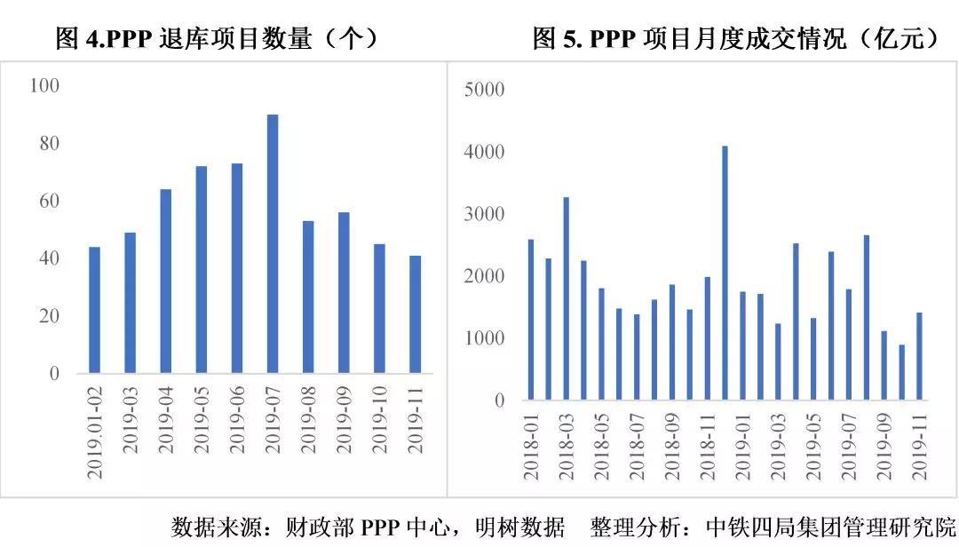 3.PPP延續(xù)高質量發(fā)展。從財政部PPP項目管理庫入庫情況看,2019年1-11月,管理庫凈入庫項目745個,投資額1.1萬億元。凈增項目數量和投資額均不足2018年同期的50%,但 落地率和開工率明顯提升。截至2019年11月,管理庫項目落地率為66.1%,較2018年底提升11.9個百分點;開工率達58.2%,較2018年底提升10.5個百分點。2019年下半年以來,PPP項目退庫情況較上半年有明顯減輕趨勢。前述情況表明,PPP項目質量不斷提升。見圖4、圖5。