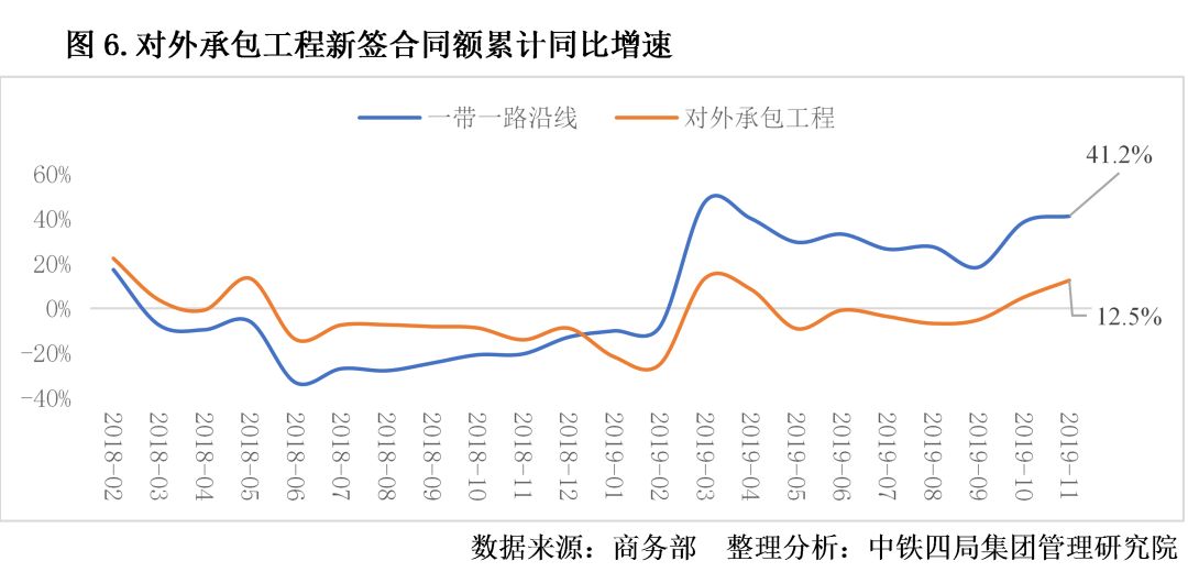 4.對外承包工程市場緩慢復蘇。2019年1-11月,我國對外承包工程累計完成新簽合同額2085.2億美元,實現營業(yè)額1349.7億美元,分別為2018年全年的86.2%、79.8%。對外承包工程市場下半年緩慢復蘇,截至11月新簽合同額同比增速提升至12.5%;營業(yè)額同比增速自5月起持續(xù)走低,截至11月增速為-2.2%?!耙粠б宦贰毖鼐€國家表現良好,2019年前11個月累計新簽合同額同比增速達41.2%,占對外承包工程比重高達61.2%,占比持續(xù)上升。見圖6。