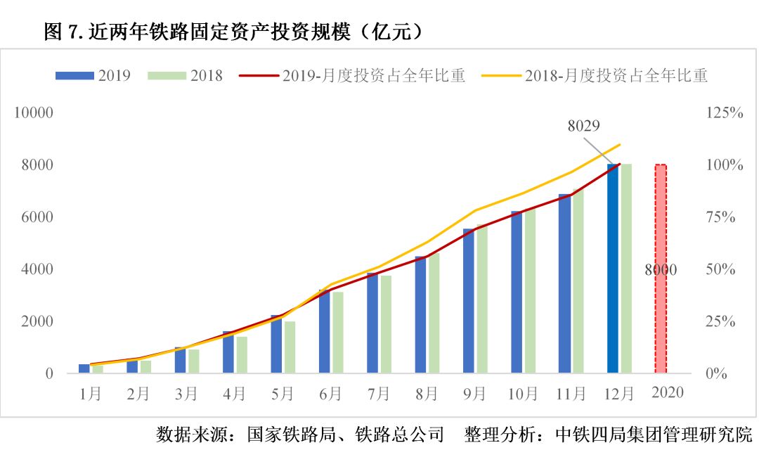 1.鐵路建設投資保持穩(wěn)定。2019年,全國鐵路固定資產計劃投資8000億元,實際完成8029億元,與2018年投資完成額(8028億元)持平,完成計劃投資額的100.36%,鐵路固定資產投資總體表現平穩(wěn)。根據2020年全國交通運輸工作會議精神,2020年全國鐵路固定資產投資計劃完成8000億元。見圖7。