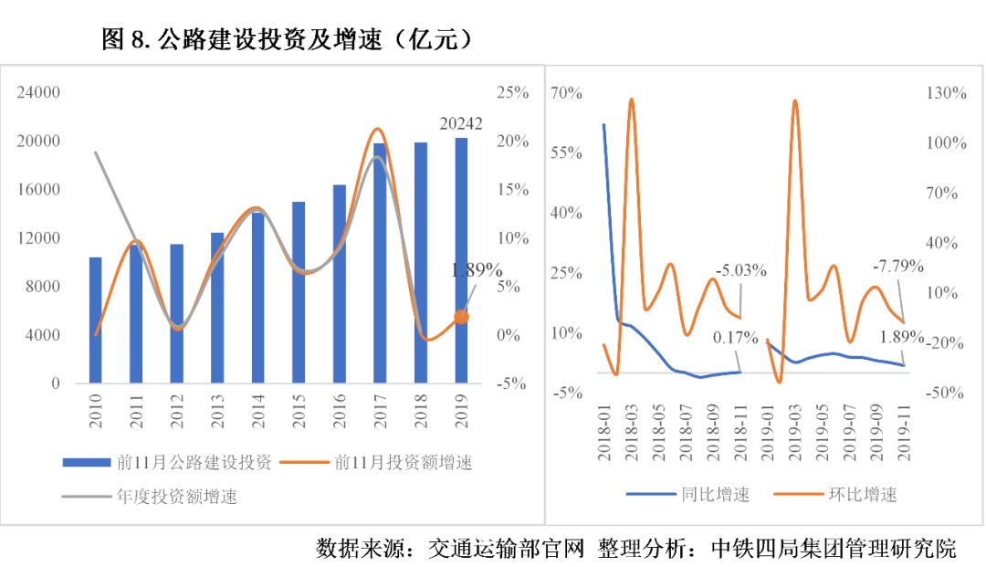 2.公路建設投資小幅回彈。2019年我國公路建設投資規(guī)模小幅增長,增速相較上年略有回升。2019年前11個月,我國公路建設累計完成投資20242.14億元,同比增長1.89%,已實現從2018年低點觸底回升,但增幅不及2012、2013年度。從月度數據來看,2019年同比增速從6月份開始轉好并保持穩(wěn)定,但環(huán)比增速與2018年同期相比持續(xù)上下波動,2019年我國公路建設累計投資大概率回暖,但增長幅度有限。見圖8。
