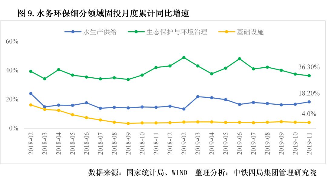 4.水務環(huán)保建設高速發(fā)展。2019年,在基礎設施投資增長緩慢背景下,水務環(huán)保市場依然保持高速增長態(tài)勢。截至11月份,生態(tài)環(huán)保與環(huán)境治理投資累計同比增速高達36.3%,高于同期基礎設施投資增速(4%)32.3個百分點;水的生產和供給投資累計同比增速高達18.2%,高于同期基礎設施投資14.2個百分點。根據中國環(huán)境保護產業(yè)協(xié)會發(fā)布的《中國環(huán)保產業(yè)發(fā)展狀況報告(2018)》顯示,2020年我國環(huán)保產業(yè)營業(yè)收入總額有望超過2萬億元。見圖9。