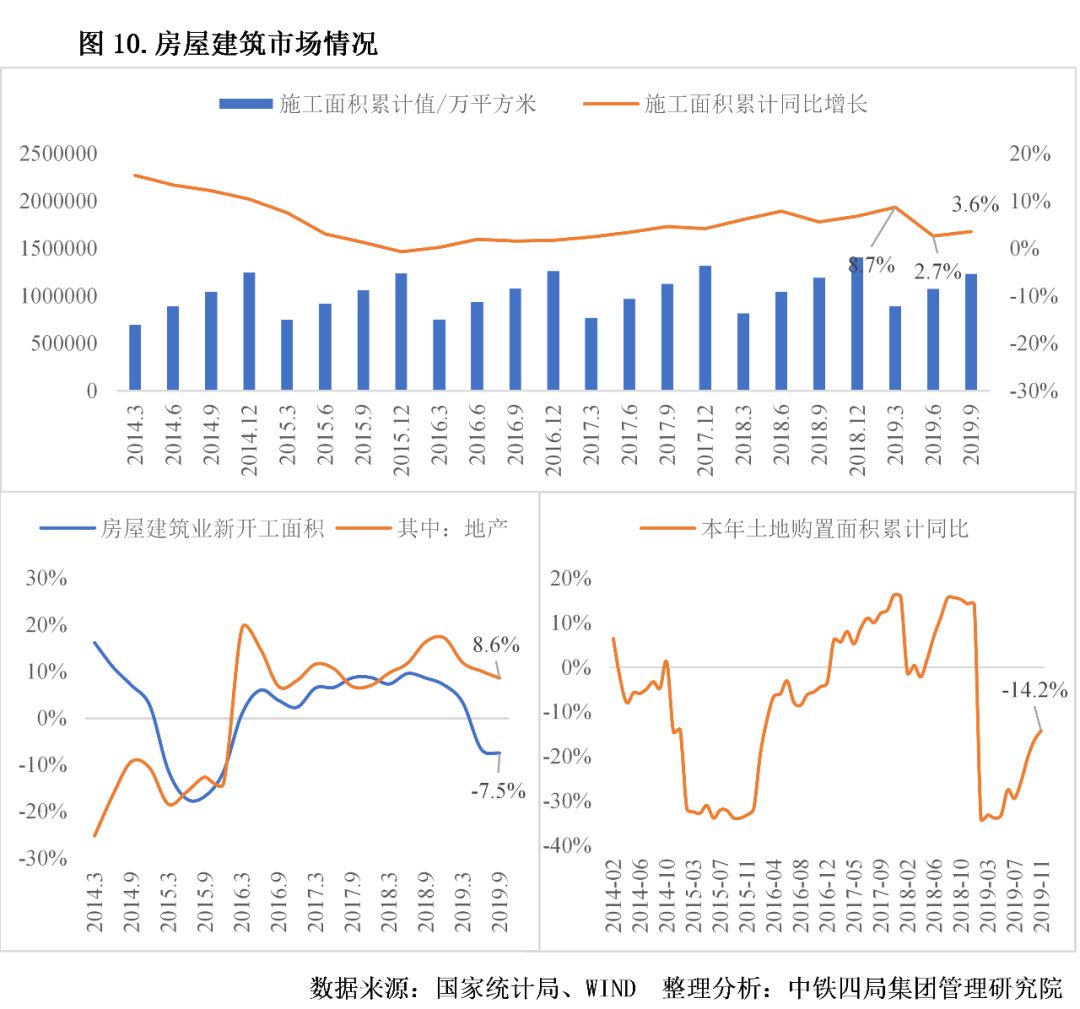 5.房屋建筑市場趨于穩(wěn)定。2019年,房屋建筑施工面積在波動中保持增長態(tài)勢。房建施工面積的穩(wěn)定與房地產市場的韌勁足有很大關系,前三季度房地產施工面積累計同比增速為10%。房地產市場的穩(wěn)健發(fā)展得力于因城施策的進一步深化,各地政府堅持實施定向微調、保障合理住房需求,行業(yè)運行制度更趨完善,一定程度上保障了房地產市場的穩(wěn)定。2019年前三個季度,房屋建筑業(yè)新開工面積增速為-7.5%,已連續(xù)兩個季度為負增長。其中,地產類新開工面積增速為8.6%,表明除地產以外的其他房建新開工情況堪憂(如公共場館、工業(yè)廠房建筑等)。從地產類土地購置面積來看,2019年累計同比增速持續(xù)為負,后續(xù)可能影響到房地產新開工面積和施工面積的增長。見圖10。