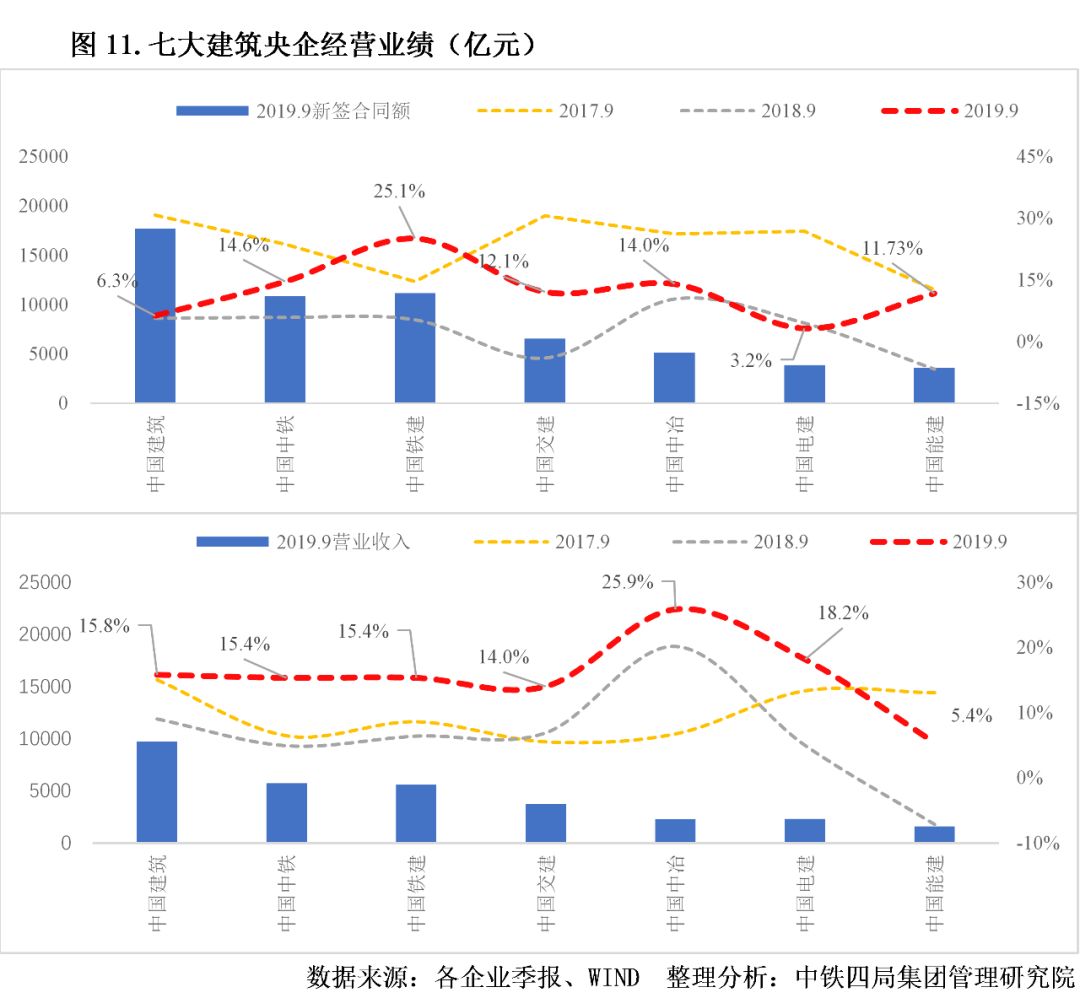 1.經營業(yè)績增速回升。2019年前三季度,七大建筑央企新簽合同額、營業(yè)收入增速較上年明顯提升,增速多在兩位數以上,明顯高于同期全國建筑業(yè)新簽合同額增速(4.38%)、總產值增速(6.7%)。由此可見,建筑央企的市場拓展能力和逆周期調節(jié)能力較強,建筑央企訂單加速增長,行業(yè)集中度持續(xù)提升。見圖11。