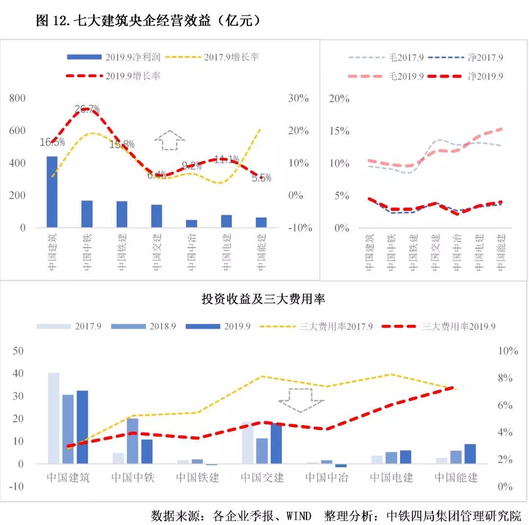 2.凈利潤增長與費用管控效果顯著。2019年前三季度,七大建筑央企中,中國建筑凈利潤為440.54億元,投資凈收益最高為32.39億元,均遠高于其他企業(yè);中國中鐵的凈利潤增速高達26.7%,遠高于其他企業(yè);除中國能建(5.5%)、中國交建(6.4%)、中國中冶(9.2%)以外,其他建筑央企凈利潤增速均超過10%。對比2017年和2019年前三季度的數據發(fā)現,各大建筑央企的毛利率變動方向不一致,凈利率變動不明顯。近三年來,除中國建筑和中國能建外,其他建筑央企的三大費用率明顯降低,其中中國交建降幅達3.38個百分點。見圖12。