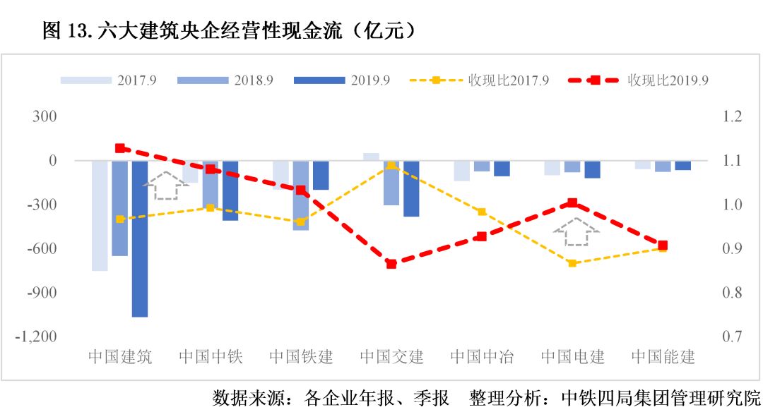 3.央企收現比明顯改善。從收現比(銷售商品、提供勞務收到的現金/營業(yè)收入)來看,近三年來,除中國交建、中國中冶、中國能建外,其他建筑央企收現比明顯改善。從現金流來看,工程施工企業(yè)的商業(yè)模式往往為前三季度現金凈支出,第四季度現金凈回流。近三年,各大建筑央企前三季度的經營性現金流普遍為負值,其中,中國建筑、中國中鐵、中國交建、中國電建2019年的現金凈流量負值進一步擴大。見圖13。