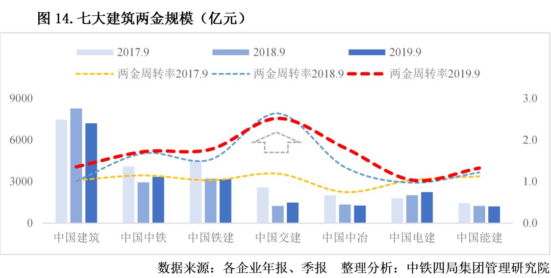 4.壓降“兩金”效果逐漸顯現。建筑業(yè)供給側改革背景下,建筑央企積極壓降“兩金”,效果初步顯現。2017年以來,各大建筑央企“兩金”周轉率結束下降趨勢,從2018年開始提升。從“兩金”規(guī)模來看,除中國電建外,其他建筑央企“兩金”總額都有所降低;從相對值來看,除中國電建和中國能建“兩金”周轉率變動不明顯外,其他建筑央企“兩金”周轉率都有明顯提升,其中中國交建提升幅度最大。見圖14。