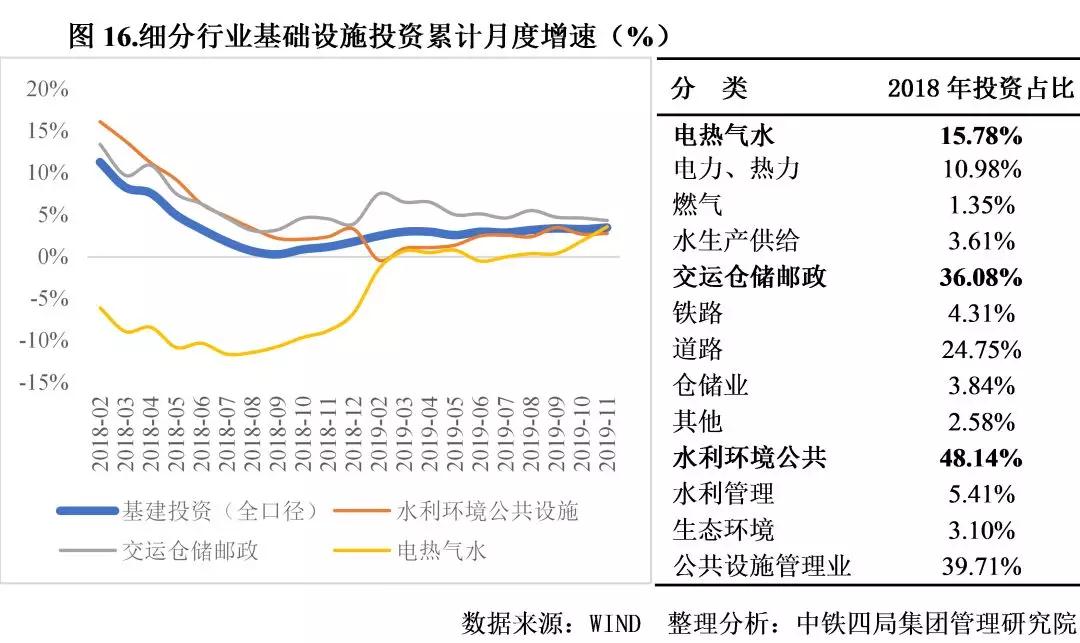 一是基建投資溫和回暖。隨著基建補短板政策陸續(xù)出臺,基建投資增速觸底反彈,自2018年9月起保持弱復蘇態(tài)勢。2019年12月中央經濟工作會議明確要求堅持穩(wěn)字當頭,預計宏觀經濟政策逆周期調節(jié)下,基建將繼續(xù)發(fā)力。2019年9月國家提前下達部分2020年新增專項債限額1萬億元,且明確規(guī)定不得用于土地儲備和房地產相關領域,全年投向基建的專項債占比有望提高至60%,疊加項目最低資本金比例由25%下調為20%,專項債可作資本金參與項目投資等規(guī)定,基建投資增速將得到提升。交通和市政仍是核心發(fā)力點。2019年道路、鐵路、公路運輸建設投資的增長促進了基建投資的復蘇,下半年國家發(fā)布《西部陸海新通道總體規(guī)劃》《交通強國建設綱要》等重大政策,預計2020年交通運輸投資建設仍將是重點。公共設施管理業(yè)占基建投資的比重達40%,中央經濟工作會議明確提出將引導資金投向供需共同受益的民生建設等短板領域,加強市政管網、城市停車場、冷鏈物流的建設,預計2020年該領域投資將迎來新機遇。見圖16。