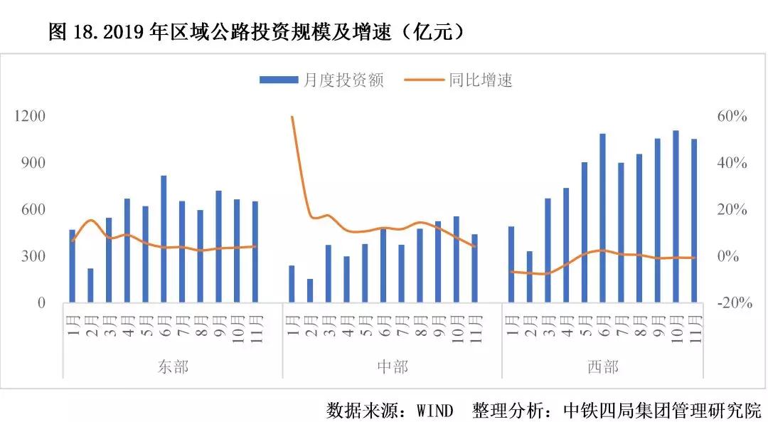 公路建設投資區(qū)域差距逐漸縮小。2019年我國公路建設區(qū)域投資格局保持不變,中部地區(qū)與東、西部地區(qū)差距進一步縮小。從投資規(guī)模來看,西部最高、東部次之,中部較低。從投資增速來看,中部地區(qū)公路投資從年初開始發(fā)力,以60.4%的增速開啟2019年的趕超步伐,2019年11個月平均增速達到16.4%;東部地區(qū)為6.0%、西部地區(qū)為-2.0%。2020年,中部地區(qū)或將進一步加大投資力度。見圖18。