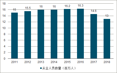 而從業(yè)人員總量由2005年的1100萬人增加到2016年的1630萬人;2017年,行業(yè)從業(yè)人員數(shù)量開始下降,截至2018年底,全行業(yè)就業(yè)人口達(dá)1300萬人以上。