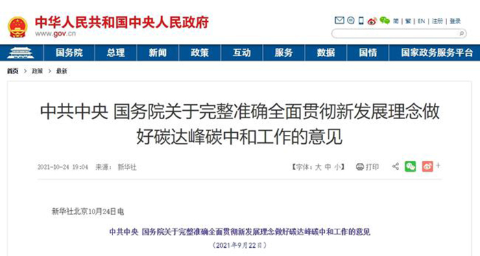 《關(guān)于完整準確全面貫徹新發(fā)展理念做好碳達峰碳中和工作的意見》提出: