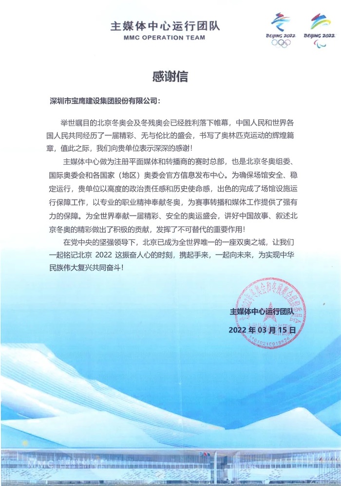 2022年3月15日,寶鷹集團(tuán)收到一封來(lái)自北京冬奧組委發(fā)來(lái)的感謝信!感謝寶鷹集團(tuán)為北京冬奧會(huì)賽事轉(zhuǎn)播和媒體工作保駕護(hù)航。