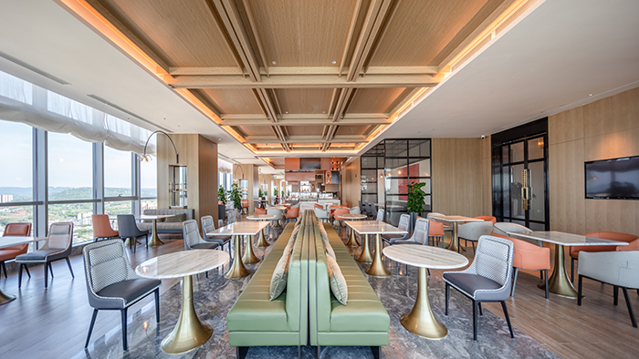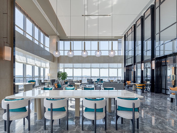 酒店的設(shè)計(jì)從南充歷史悠久的古鎮(zhèn)老街、絲綢文化汲取創(chuàng)意,將歷史文化與現(xiàn)代建筑完美結(jié)合。大堂以簡約大方的造型表達(dá),整個(gè)空間色彩明快、柔和,既現(xiàn)代簡約,又時(shí)尚活潑,從視覺上凝聚顏色,從空間上體現(xiàn)美感。110米高空的超大雙層落地窗,可俯瞰南充市全景,展現(xiàn)人們對(duì)自由生活享受的向往。