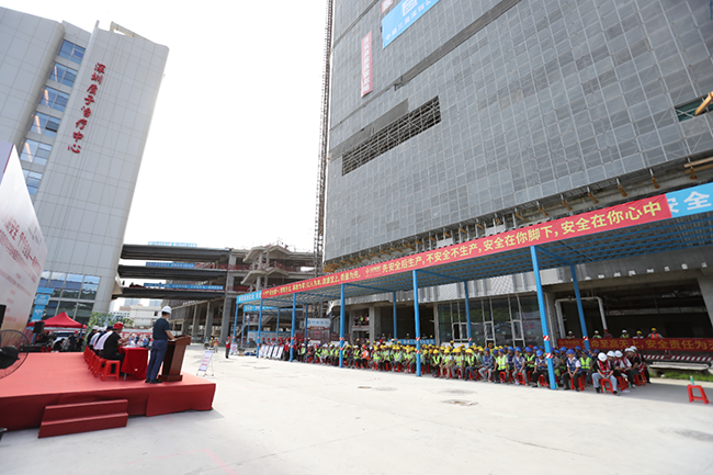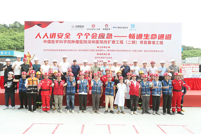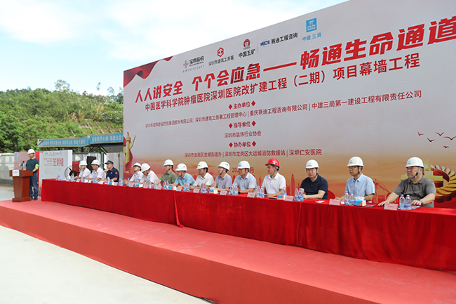 深圳市建筑工務(wù)署工程管理中心副主任符翔、項目工程師殷積彪,深圳市裝飾行業(yè)協(xié)會常務(wù)副會長、總工程師王彥波、培訓(xùn)中心主任莫晉里,深圳市龍崗區(qū)龍城街道辦副主任程俊雄、副主任雷煥雄,深圳市龍崗區(qū)大運城消防救援站副站長何明,重慶賽迪工程咨詢有限公司大灣區(qū)分公司總經(jīng)理付光平,中建三局集團(深圳)有限公司一公司安全總監(jiān)劉振曉,深圳仁安醫(yī)院常務(wù)副院長吳云劍,深圳市寶鷹建設(shè)集團股份有限公司董事長肖家河、副總裁鐘志剛、安全管理部總監(jiān)陳龍、幕墻事業(yè)部總經(jīng)理韓偉杰、公司技術(shù)負(fù)責(zé)人葉石堅等相關(guān)領(lǐng)導(dǎo)以及中國醫(yī)學(xué)科學(xué)院腫瘤醫(yī)院深圳醫(yī)院改擴建工程(二期)幕墻項目建設(shè)者參加活動。