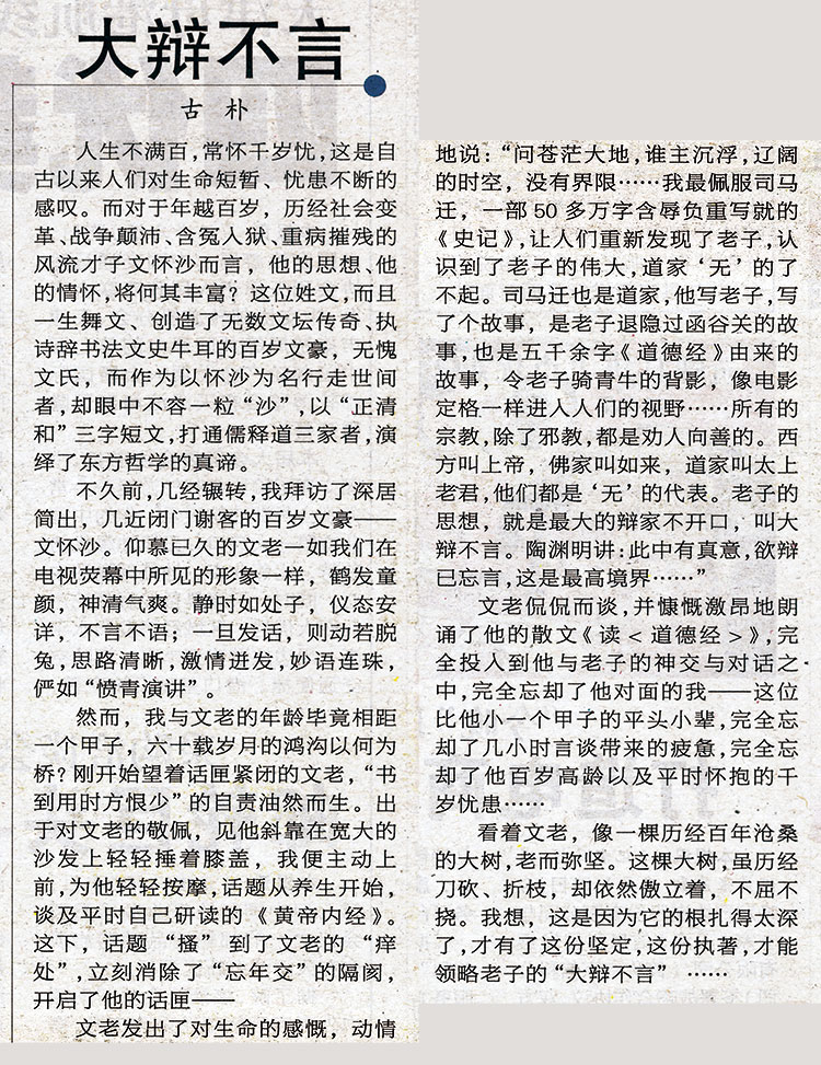 文章《安靜與力量》刊登在 9 月 3 日的《人民日報》副刊,文章《大辯不言》刊登在 9 月 9 日的《渤海早報》副刊。兩篇文章分別是古樸先生對文化名人周國城先生、文懷沙先生及其相關(guān)作品和思想的見解與感受。文章樸實、自然,文風純正,語言簡潔、明快,主旨明確、暢達,充分闡述了自己對中國文化的見解,表達了對中國傳統(tǒng)文化的熱愛以及對文懷沙、周國城等文化大師的崇敬。我國著名的國學大師文懷沙老先生讀完文章后親筆評價到“陶令欲辯忘言,古樸每落言詮,俱登妙諦也?!?/p>