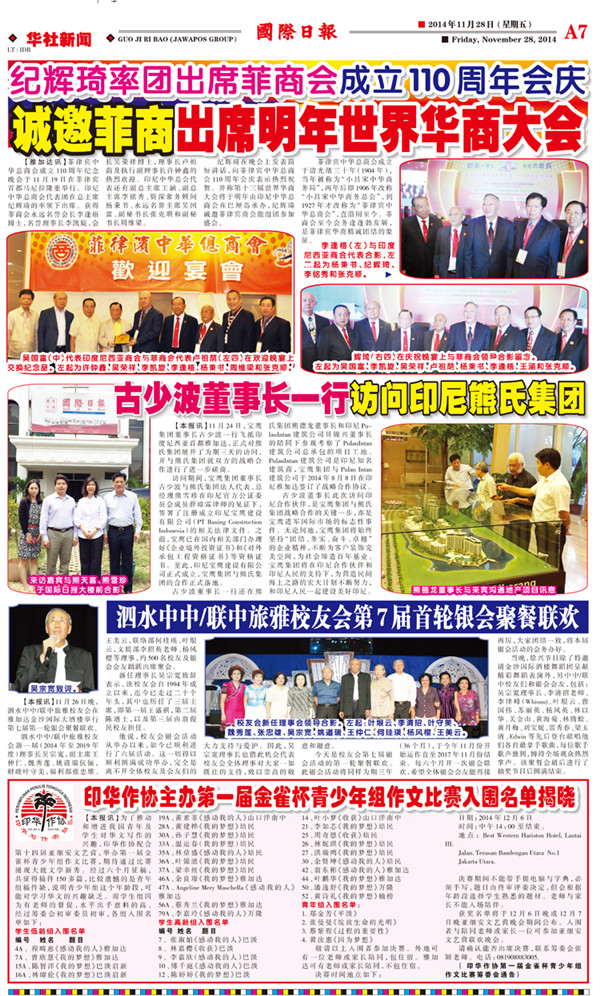 印尼《國際日報》于2014年11月28日A7版刊發(fā)了《古少波董事長一行訪問印尼熊氏集團》一文,現(xiàn)本網(wǎng)予以轉(zhuǎn)載。