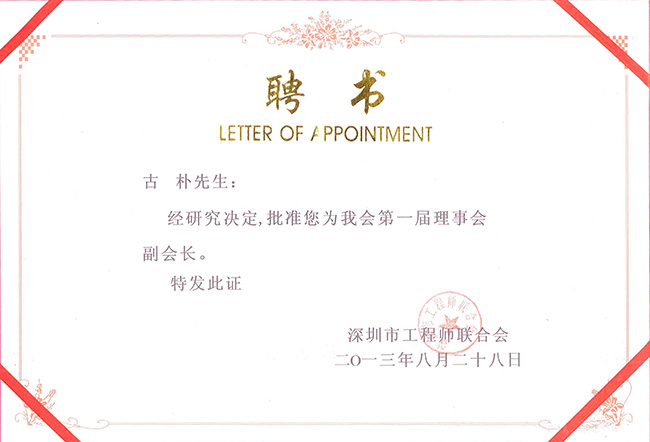 集團(tuán)副總裁古樸榮聘為深圳市工程師聯(lián)合會(huì)第一屆理事會(huì)副會(huì)長(zhǎng)