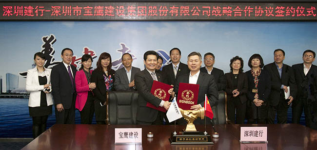 11月28日,中國建設(shè)銀行深圳市分行與深圳市寶鷹建設(shè)集團(tuán)股份有限公司簽定了授信25億元的戰(zhàn)略合作協(xié)議。當(dāng)日下午,在建設(shè)銀行深圳市分行與寶鷹股份相關(guān)出席領(lǐng)導(dǎo)的共同見證下,建設(shè)銀行深圳市分行副行長戴惠明和寶鷹股份董事局主席古少明分別代表建設(shè)銀行深圳市分行和寶鷹股份簽定了戰(zhàn)略合作協(xié)議。
