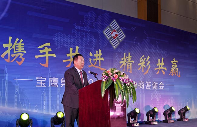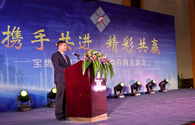 最后,古樸副總裁發(fā)表了熱情洋溢的祝酒辭,他對現(xiàn)場所有供應(yīng)商多年來與寶鷹股份結(jié)成的“攜手共進(jìn),精彩共贏”寶貴友誼表達(dá)了由衷的敬意和感謝,并期望以此次答謝會(huì)為契機(jī),增進(jìn)公司與供應(yīng)商之間的廣泛交流,推動(dòng)公司和行業(yè)的可持續(xù)發(fā)展。