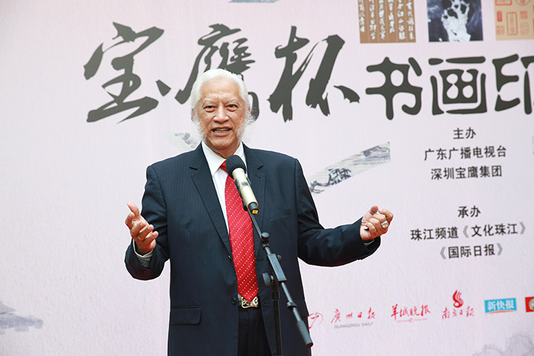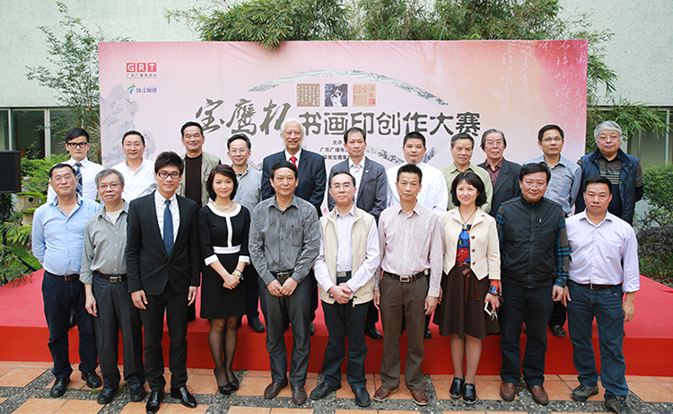 參加此次啟動儀式的主要嘉賓還有國際知名僑領(lǐng)、印尼熊氏集團董事長熊德龍等特邀嘉賓,廣東廣播電視臺副臺長蔡照波,副總編輯楊卓興等主辦方領(lǐng)導(dǎo),中國美術(shù)家協(xié)會副主席、廣東文聯(lián)主席、廣東美術(shù)家協(xié)會主席、廣東畫院院長、著名畫家許欽松,中國美術(shù)館原副館長、著名美術(shù)評論家、書畫家梁江,廣東畫院黨委書記、副院長洪楚平,西泠印社篆刻研究室主任、著名篆刻家、書法家余正,廣東省書法家協(xié)會原副主席、著名畫家、詩人歐廣勇,廣東省書法家協(xié)會原副主席、廣州市美術(shù)家協(xié)會主席、西泠印社理事、著名書畫家周國城,廣東省嶺南文化藝術(shù)促進基金會書畫藝委會主任、廣州市藝術(shù)品行業(yè)商會常務(wù)副會長兼書畫藝委會主任、著名書畫鑒定專家、書法家嚴君云,廣東省文物鑒定站鑒定專家、著名書法家、篆刻家潘鳴皋,西泠印社社員、東莞旗峰山博物館名譽館長、著名書法家、篆刻家王躍慶等評委代表。該啟動儀式標志著“寶鷹杯”國際書畫印創(chuàng)作大賽正式拉開帷幕。