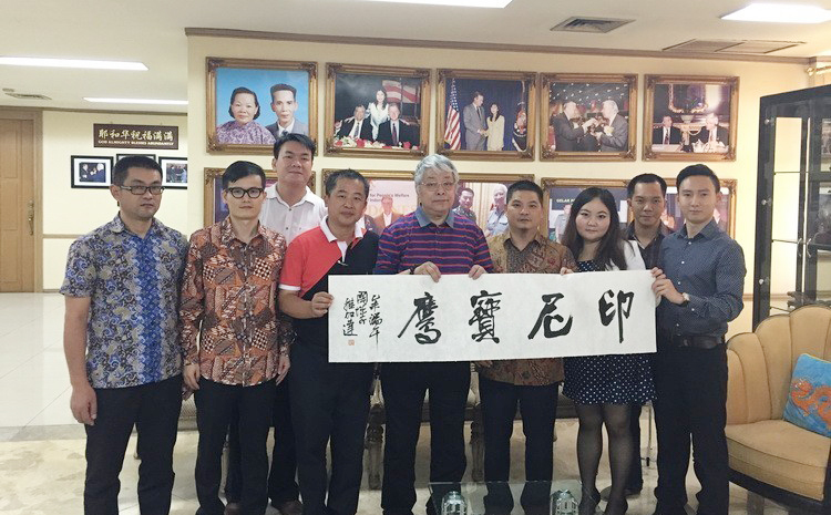 周國城主席為印尼寶鷹題字(右二為周國城主席,右一為古樸副總裁,右三為劉思東副主席)