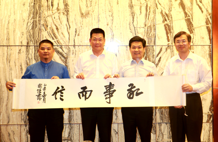左二:廣東外語外貿(mào)大學(xué)校長(zhǎng)仲偉合 右二:寶鷹集團(tuán)董事局主席古少明 右一廣東外語外貿(mào)大學(xué)副校長(zhǎng)何傳添,左一:寶鷹集團(tuán)副總裁古樸