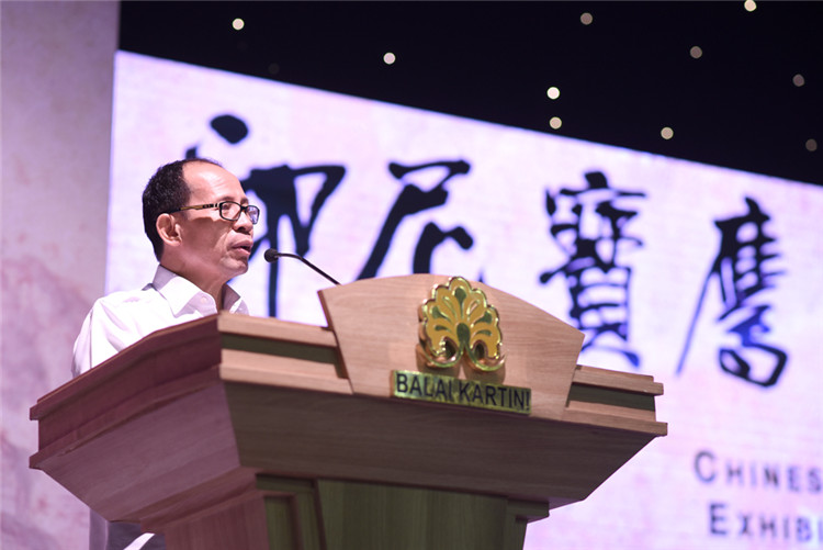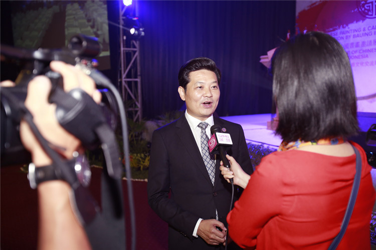 ▲印尼旅游部副部長IGEDEPITANA為印尼寶鷹中國書畫邀請(qǐng)展鳴鑼開幕