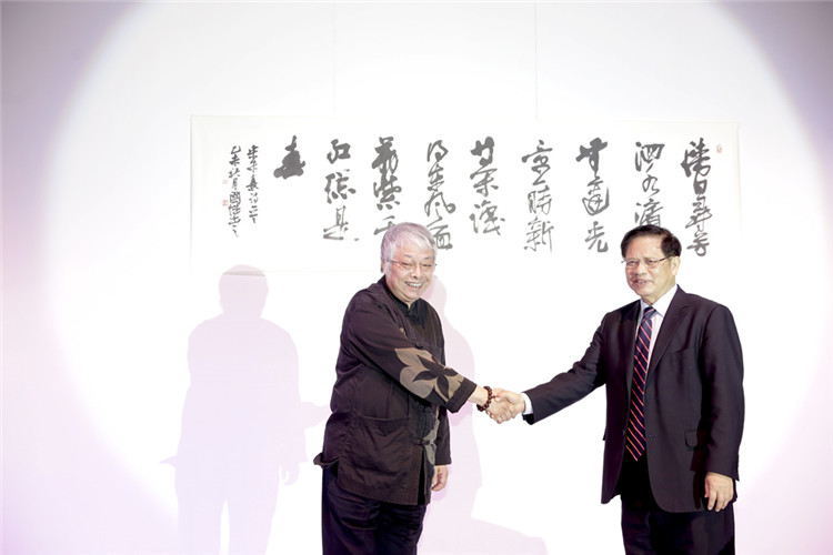 ▲謝鋒大使在古少明主席、周國城主席、古樸副總裁陪同下欣賞畫展作品