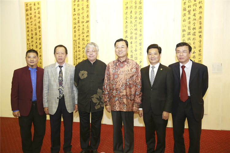 ▲印尼旅游部長阿利耶夫(右二)蒞臨書畫展開幕式,與古少明主席(左一)、廣東外語外貿(mào)大學(xué)副校長何傳添(左二)、李大西博士(右一)合影