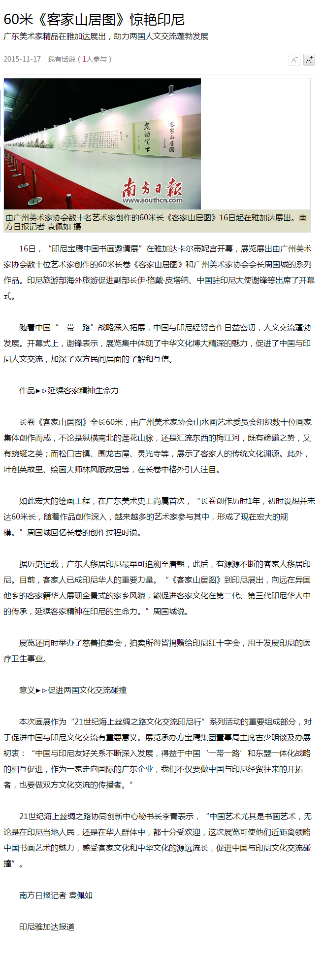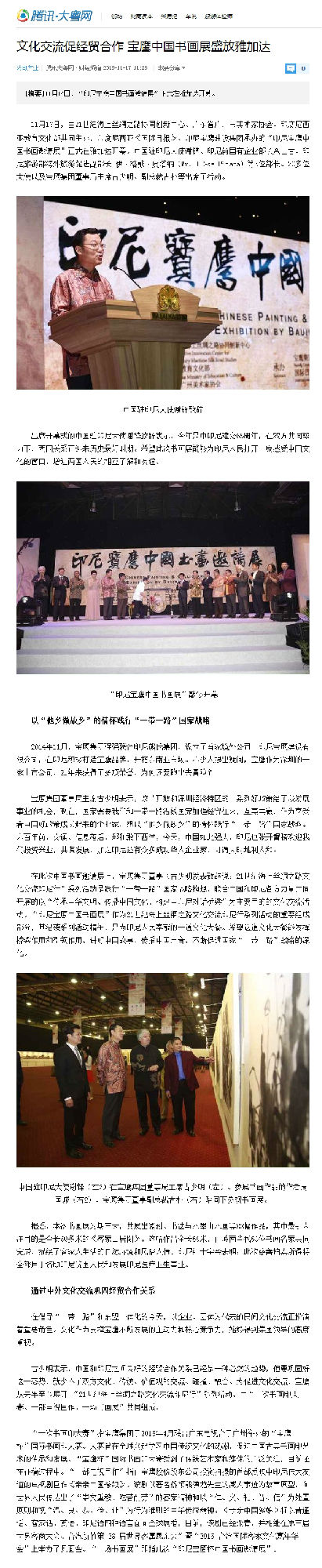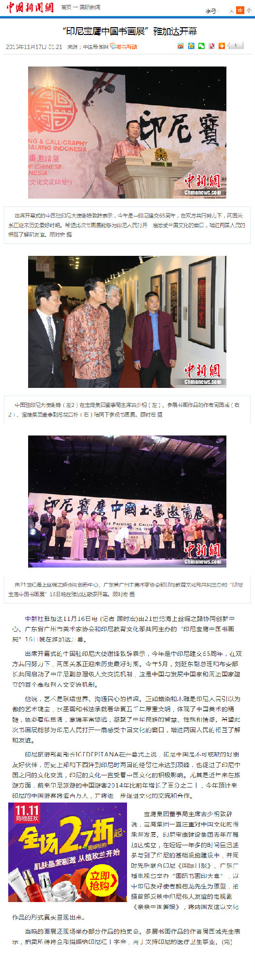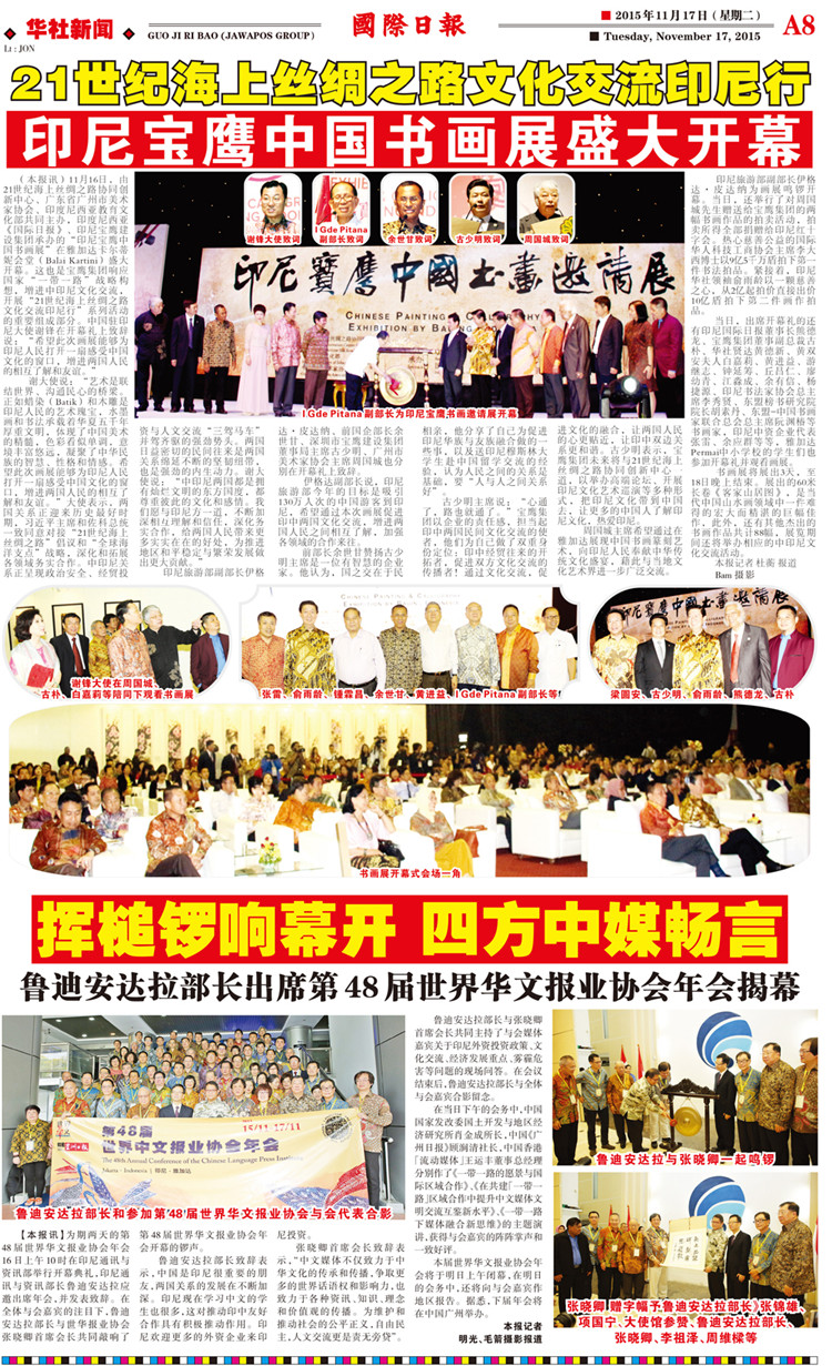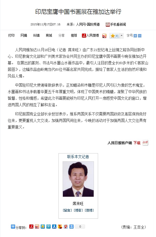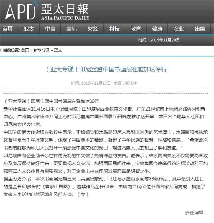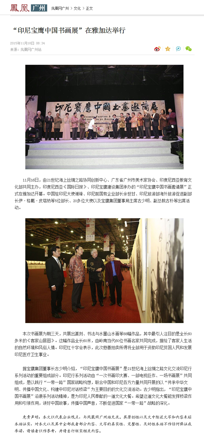 11月16日晚--18日,由21世紀(jì)海上絲綢之路協(xié)同創(chuàng)新中心、廣東省廣州市美術(shù)家協(xié)會(huì)和印尼教育文化部共同主辦,寶鷹集團(tuán)、印尼《國際日?qǐng)?bào)》承辦,印尼旅游部協(xié)辦的“印尼寶鷹中國書畫展”在印度尼西亞雅加達(dá)卡爾蒂妮宮盛大舉行。