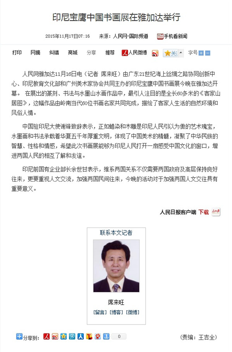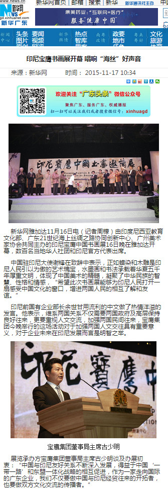請(qǐng)點(diǎn)擊以下鏈接觀看深圳衛(wèi)視《深視新聞》欄目對(duì)印尼寶鷹書畫邀請(qǐng)展的報(bào)道: http://www.cutv.com/v2/2015-11-17/G16ghgggihkknnllhmh9g6.shtml?from=timeline&isappinstalled=0