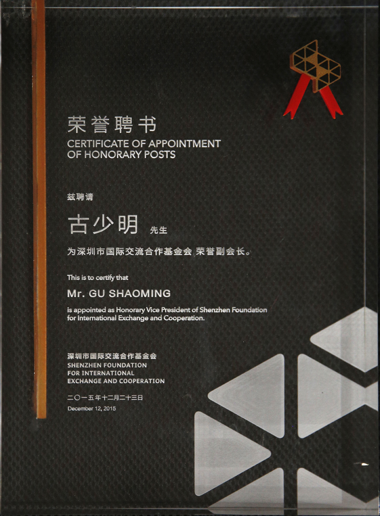 2015年12月23日晚,“問計天下深士”沙龍暨深圳市國際交流合作基金會周年活動于深圳東海朗廷酒店舉辦,因在國際交流尤其是一帶一路經(jīng)貿(mào)合作與文化交流中的突出貢獻,寶鷹集團董事局主席古少明被聘為深圳市國際交流合作基金會榮譽副會長,寶鷹集團副總裁古樸受古少明主席委托代為出席并領取聘書。