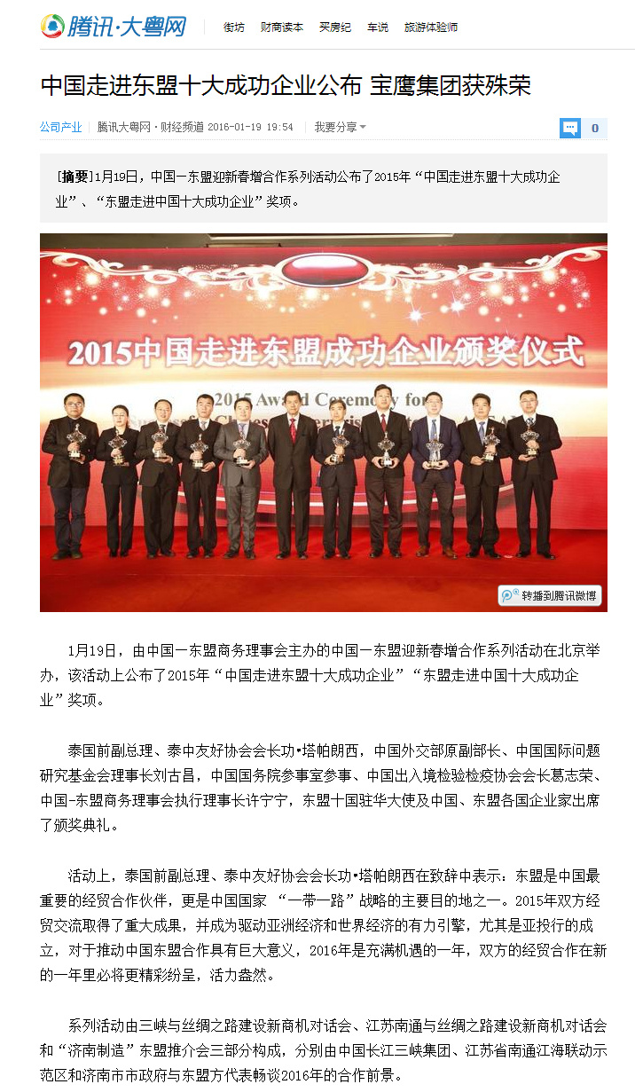 ▲寶鷹集團(tuán)入選2015中國(guó)走進(jìn)東盟十大成功企業(yè)