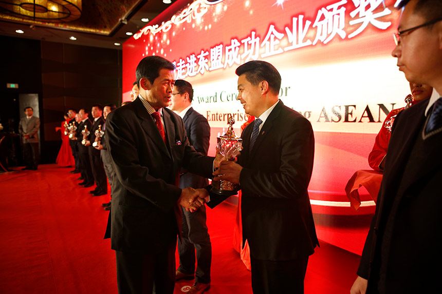 頒獎(jiǎng)環(huán)節(jié),緬甸駐華大使蒂林翁宣讀“2015中國(guó)走進(jìn)東盟十大成功企業(yè)”名單。獲評(píng)“2015中國(guó)走進(jìn)東盟十大成功企業(yè)”的有:中資越南光伏科技有限公司、深圳寶鷹建設(shè)集團(tuán)股份有限公司、江蘇滌諾日化集團(tuán)有限公司、中冶置業(yè)(新加坡)有限公司、中國(guó)水利電力對(duì)外公司、中國(guó)路橋工程責(zé)任有限公司、中國(guó)電建集團(tuán)海外投資有限公司、山東玲瓏輪胎股份有限公司、中國(guó)港灣工程有限責(zé)任公司、廣聯(lián)達(dá)軟件股份有限公司。其中,中字頭企業(yè)占據(jù)6家。