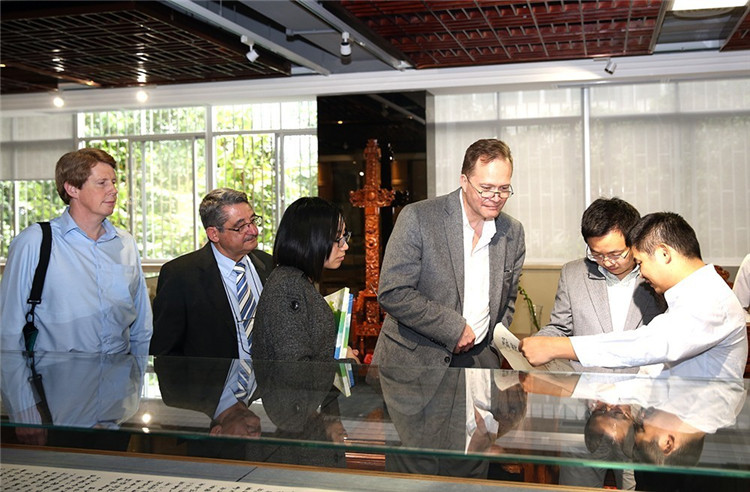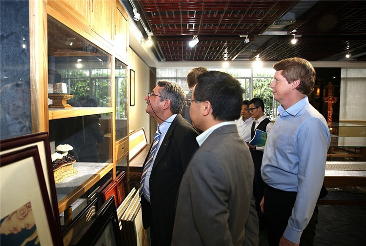 ▲專家們在古樸副總裁的引導下參觀寶鷹美術館