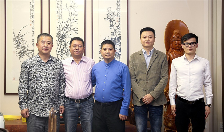 ▲中國(guó)華西企業(yè)股份有限公司廣州分公司總經(jīng)理羅征祥(中)一行蒞臨寶鷹集團(tuán),受到古少波董事長(zhǎng)(左二)的盛情接待