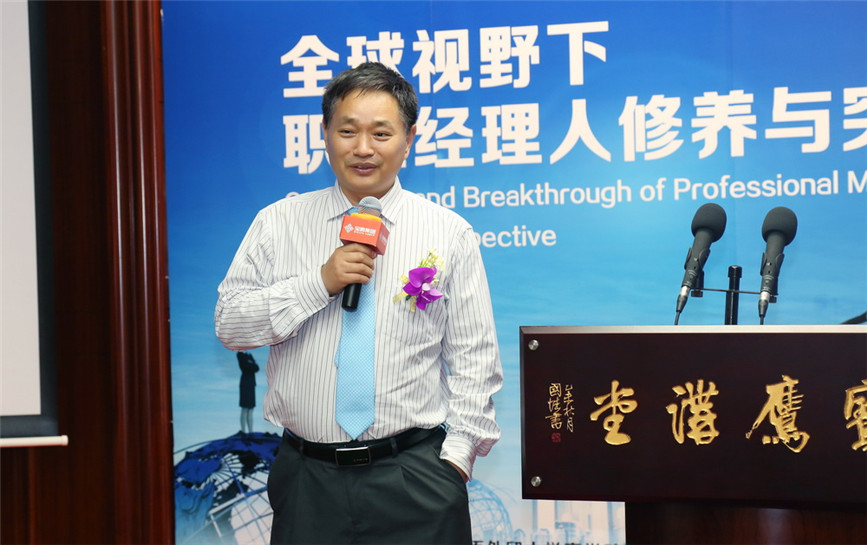 ▲ 廣東外語外貿(mào)大學(xué)商學(xué)院執(zhí)行院長 朱文忠?guī)怼度蛞曇跋侣殬I(yè)經(jīng)理人職業(yè)道德與社會責(zé)任》主題講座