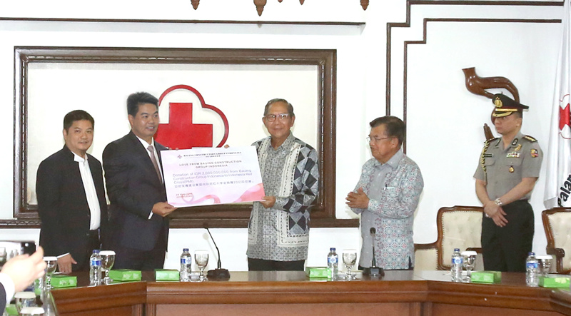 ▲印尼紅十字會(huì)代表吉南加接受寶鷹股份董事長(zhǎng)古少波捐贈(zèng)20億印尼盾(左一:寶鷹集團(tuán)副總裁古樸,左二:寶鷹股份董事長(zhǎng)古少波,左三:印尼紅十字會(huì)代表吉南加,左四:印尼副總統(tǒng)尤素夫·卡拉)