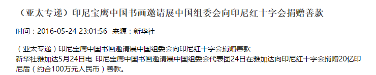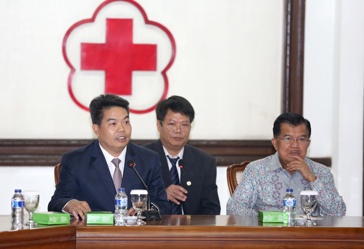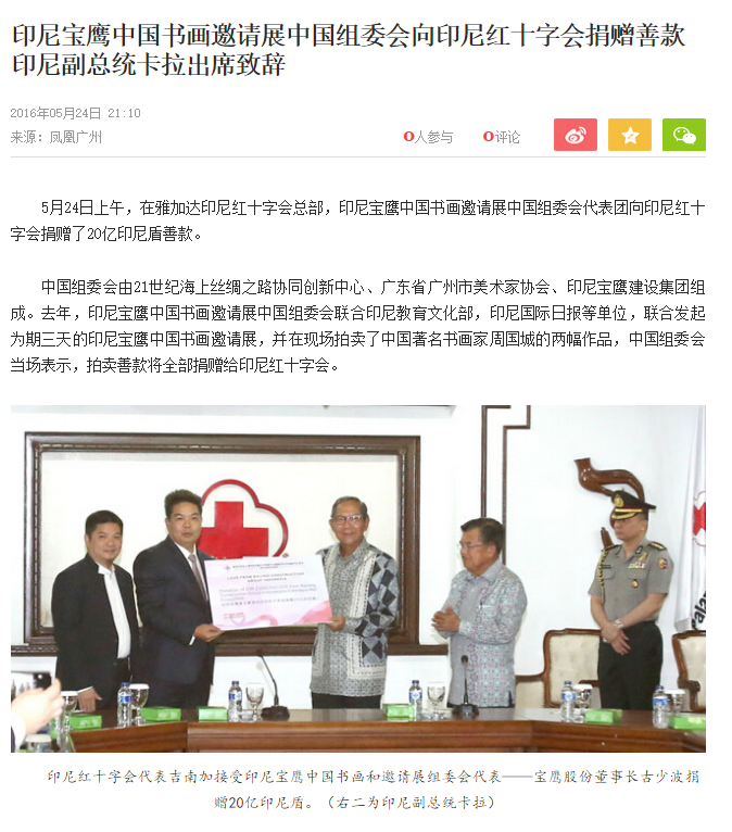 5月24日上午,在雅加達(dá)印尼紅十字會(huì)總部,寶鷹股份董事長(zhǎng)古少波代表印尼寶鷹中國(guó)書畫邀請(qǐng)展中國(guó)組委會(huì)向印尼紅十字會(huì)捐贈(zèng)了20億印尼盾善款。印尼副總統(tǒng)、印尼紅十字會(huì)總主席卡拉見證捐贈(zèng)并發(fā)表致辭。