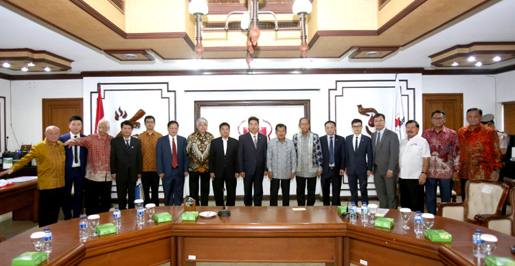 ▲合影(左二:董賓,左三:熊德龍,左四:蔡金城,左五:孫亮,左六:李大西,左七:周國(guó)城,左八:古樸,左九:古少波,右八:印尼副總統(tǒng)尤素夫·卡拉,右七:吉南加,右六:溫林樹,右五:吳義課,右四:潘逸航)